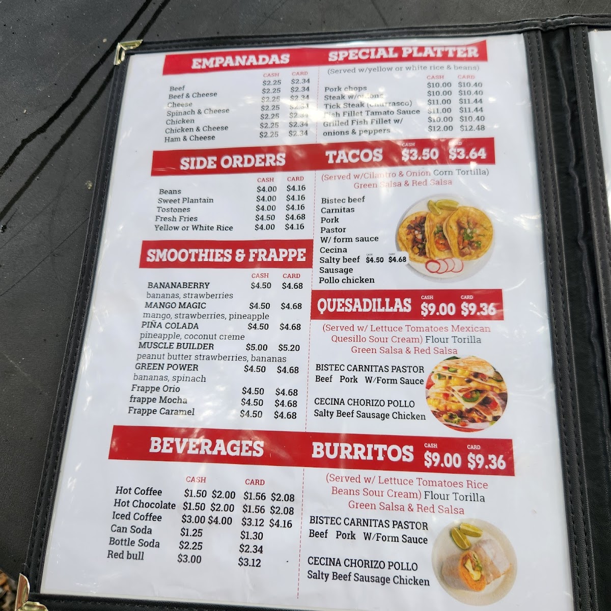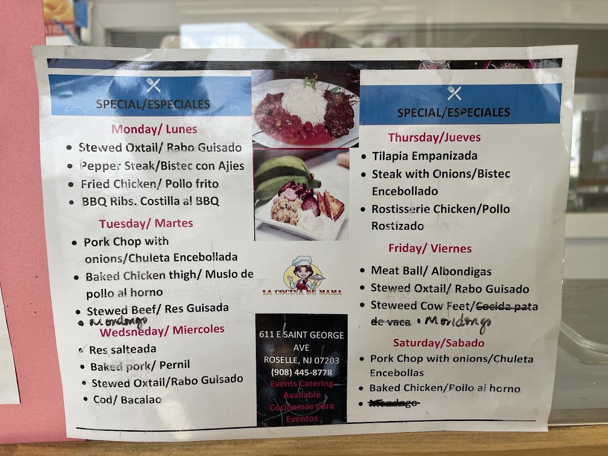 La Cocina De Mama in Roselle, NJ offers a delightful menu that features a variety of traditional Latin dishes, perfect for any time of the day. For breakfast, diners can enjoy the hearty Los Tres Golpes Breakfast or the Los Quatro Golpes Breakfast, both packed with delicious options to kickstart the day. Appetizers include the classic Beef Patty and Cheese Patty, ideal for a light bite before the main meal. The comforting Chicken Soup is a perfect choice for those craving something warm and soothing. When it comes to rice, White Rice serves as a simple yet essential side dish to complement the flavors of any main course. For lunch, customers can indulge in savory dishes such as the Stewed Chicken Lunch, Baked Chicken Lunch, or the flavorful Pork Chops & Onions Lunch. A range of refreshing beverages are available, including Bottled Juice, Canned Soda, Brisk Iced Tea, Bottled Tea, and Bottled Water. To satisfy your sweet cravings, they also offer Lemonade along with a variety of Natural Juices & Shakes. Whether you're stopping by for a quick breakfast or a fulfilling lunch, La Cocina De Mama provides a satisfying and diverse menu that caters to every palate.
